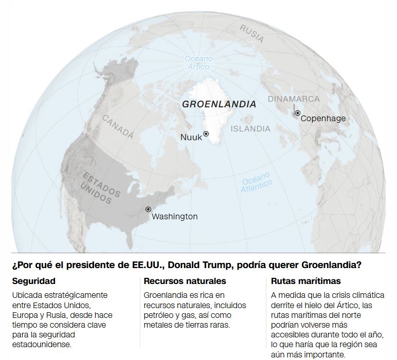 Trump exploró la posibilidad de comprar Groenlandia durante su primer mandato y, a pesar de que la isla le respondió que “Groenlandia no está en venta”, volvió a plantear la cuestión en diciembre de 2024, afirmando en una publicación en las redes sociales: “Por motivos de seguridad nacional y libertad en todo el mundo, Estados Unidos de América considera que la propiedad y el control de Groenlandia son una necesidad absoluta”.